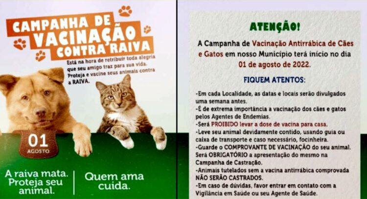 A Vigilância em Saúde de Baldim iniciará a vacinação contra a Raiva para cães e gatos, 01 de agosto. Devem ser vacinados os cães e gatos acima de três meses de idade, cujo objetivo principal é manter controlada a raiva animal.