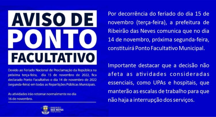 Agenda Ribeirão das Neves terá ponto facultativo no próximo feriado Alice Crepaldi 13/11/2022 0 Comentários