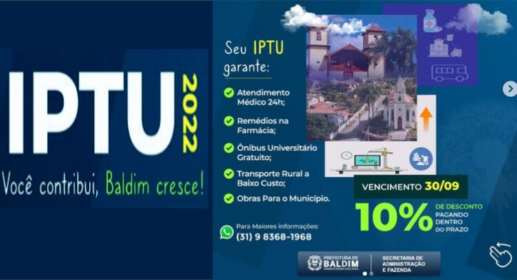 O cidadão, ao pagar seu IPTU, assegura seu poder de reivindicação: cobrar um atendimento de saúde eficiente, a limpeza das vias públicas, uma educação de qualidade para seus filhos e a segurança da nossa cidade. Pague seu IPTU e regularize seus débitos e ajude na construção de uma nova Baldim, ainda melhor e mais querida.
